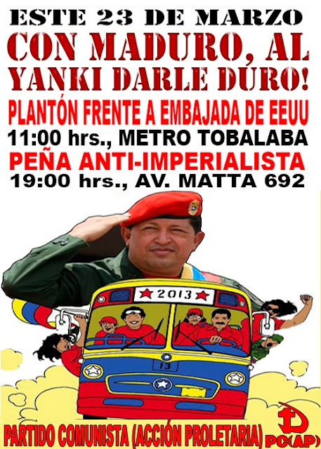 Sábado 23 de Marzo: “Con Nicolás Maduro, al yanqui dale duro”, nos juntaremos en el Metro Tobalaba, a las 10:30 horas am, para realizar posteriormente un plantón en el frontis de la embajada yanqui y rechazar la intervención en las próximas elecciones en Venezuela.